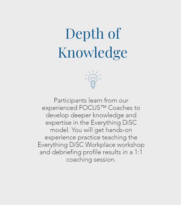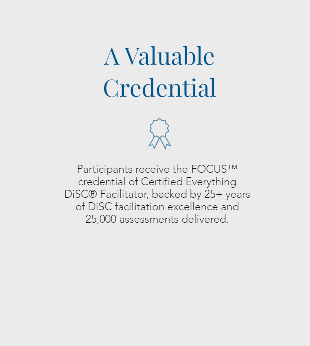 Accessible from the convenience of your home or office computer, the Everything DiSC Workplace Leader Training offers the flexibility of self-paced learning paired with live, virtual classroom sessions led by our expert FOCUS™ Coaches.