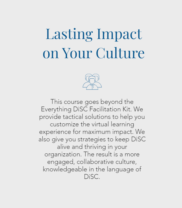 Private Group Trainings are available, contact us to enroll. Investment is $4495, which includes the purchase of a Facilitator Kit. DiSC Workplace Facilitation Kits are available in multiple languages, inquire within. If your organization already owns a DiSC Workplace Facilitator Kit, you may be able to share.